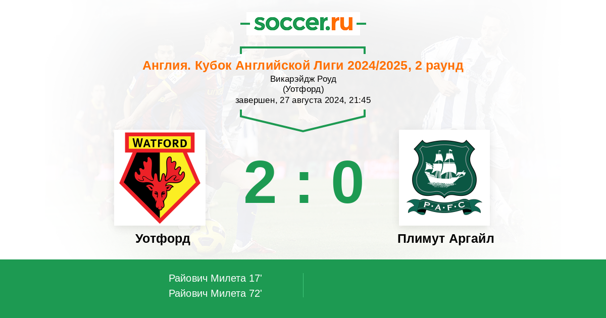 Протокол матча Уотфорд против Плимут Аргайл