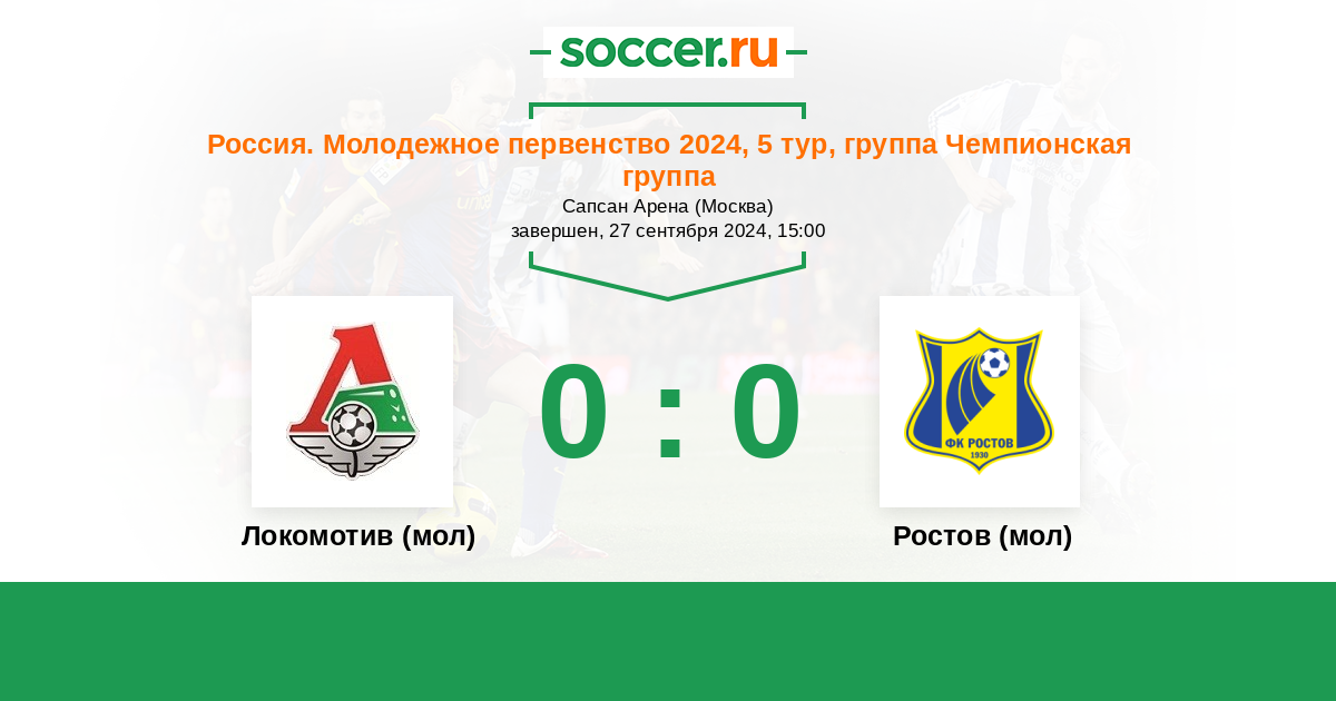 Россия. Премьер-Лига U21 23.09.2016 Ростов (мол) Логотип футбольный клуб Ростов (мол) (Ростов-на-Дону) 0:4 Логотип футбольный клуб Локомотив (мол) (Москва) Локомотив (мол)