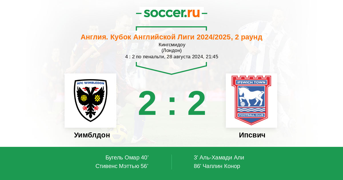 Интересно, что совсем недавно – в январе 2024 года – эти команды уже встречались друг с другом в официальном матче. Это была игра в рамках 1/32 финала Кубка Англии, и тогда Испвич Таун на выезде одержал убедительную победу (3:1). Думаю, и сегодня гости разгромят Уимблдон
