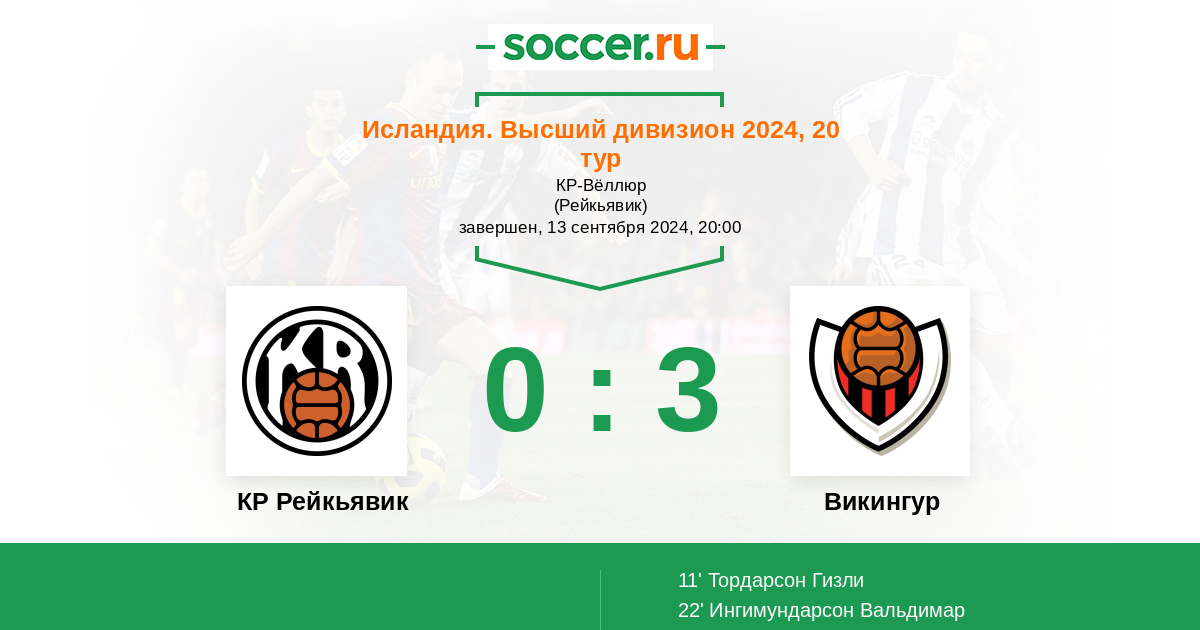 22' (0:2) Ингимундарсон Вальдимар (25) (Тордарсон Гизли (11))