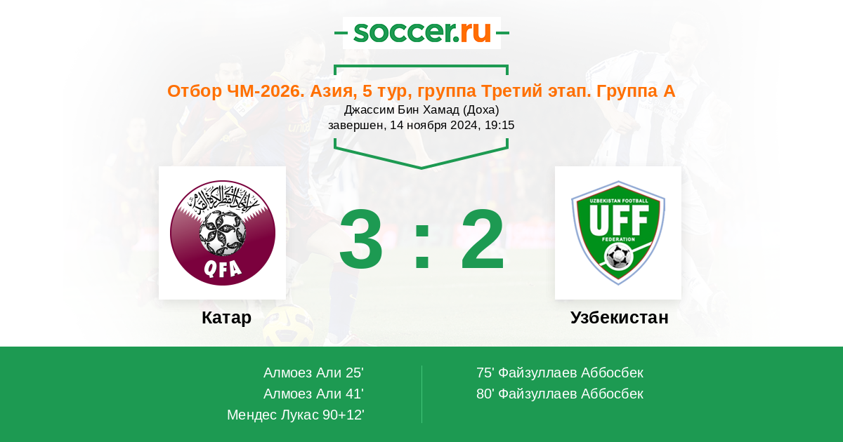 Дубль маленького и шустрого Аббосбека (оба гола головой забил) не принесли сб Узбекистана ничью. На самых последних секундах пропускаем. И игры у Катара не было, как таковой во втором тайме. Один единственный момент и гол. Жаль конечно. Катанец не должен был снова на пять защитников переходить, как только забили второй гол.