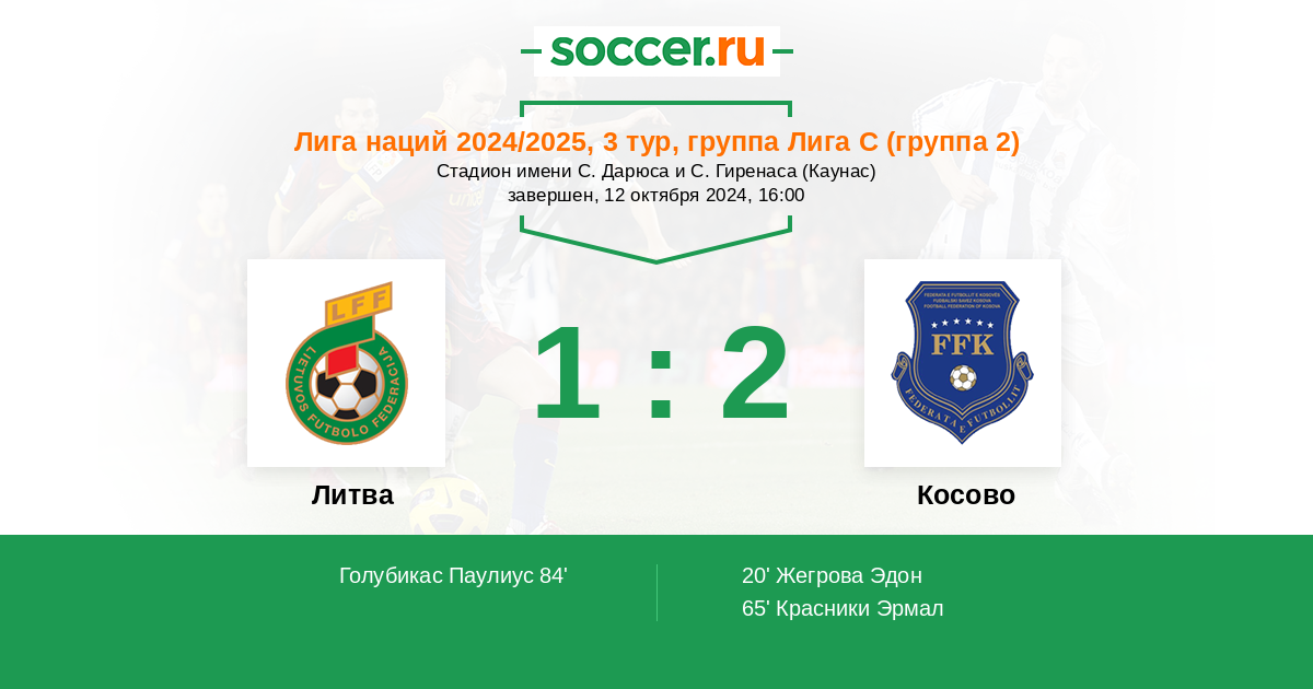 Когда-то литовский футбол был на подъёме. Жальгирис из Вильнюса, в своё время, становился бронзовым призёром чемпионата СССР по футболу. Те времена давно прошли... Сейчас сборная Косово способна удивить любого соперника. Правда в этом матче будет ничья. Счёт 0:0