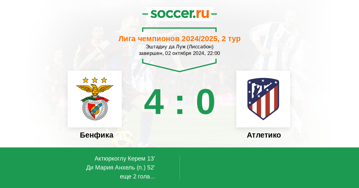 Атлетико слишком много сил отдал в дерби с Реалом. Сомневаюсь, что Матрасники качественно восстановятся к этому матчу. Бенфика не совсем хорошо начала сезон в Португалии, есть спрос на хорошую, победную игру. Счёт 1:0