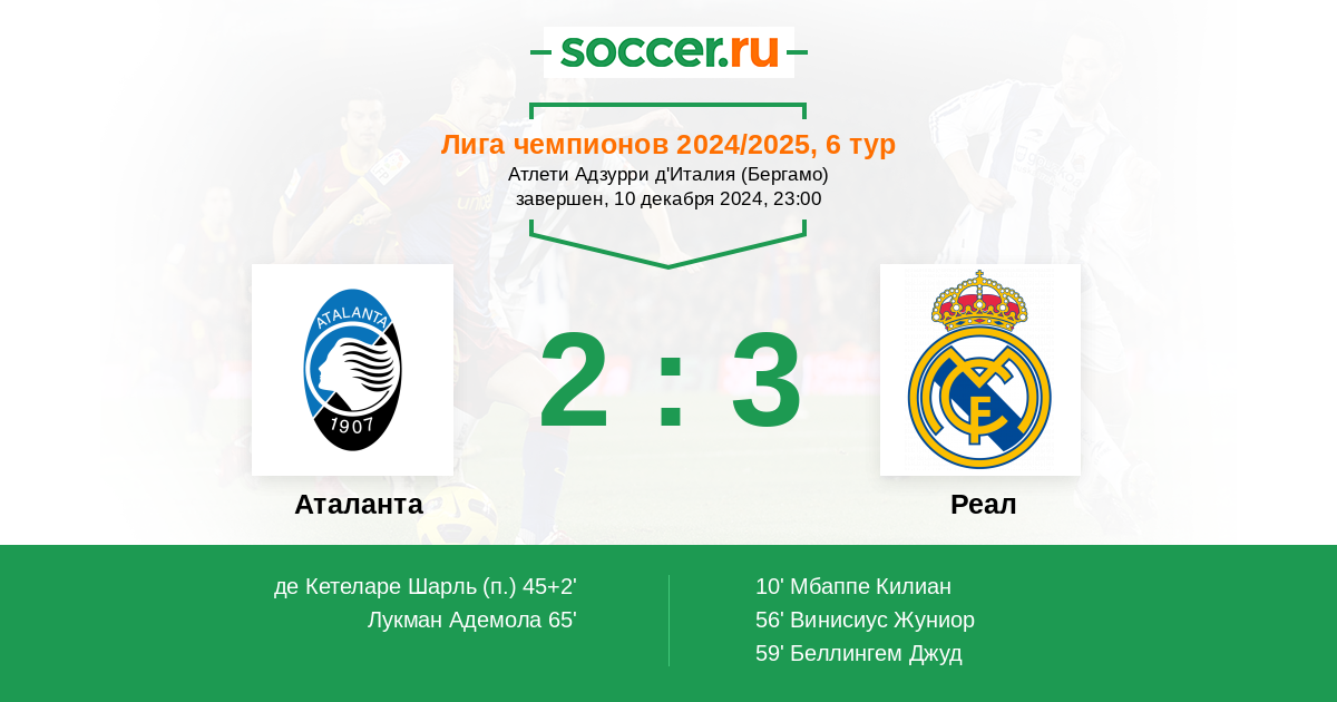 У Реала сейчас куча проблем, травмы отсутствие игры, мбаппе и тд. У Аталанты победная серия достигла 9 матчей к ряду, при этом серия без поражений длится с сентября. Аталанта играет в красивый и результативный футбол, Реал же будет стараться разрушать этот футбольный шедевр, но Аталанта сейчас сильнее, так что думаю Реал свой гол забьет, но победа за аталантой.