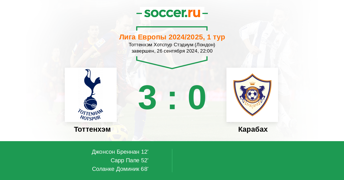В матче Лиги Европы между командами Тоттенхем и Карабах смею предположить победу хозяев, потому как их рейтинг УЕФА гораздо выше гостей, к тому же они играют при поддержке своих болельщиков.