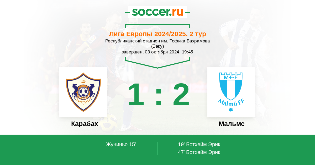 Карабах уже давно стал крепким клубом европейского уровня. Он побеждал и более серьёзных соперников, чем коллектив из Швеции. Придётся, конечно, потрудиться, игра будет открытой, хозяева сыграют первым номером и выиграют не пропустив. Счёт 2:0