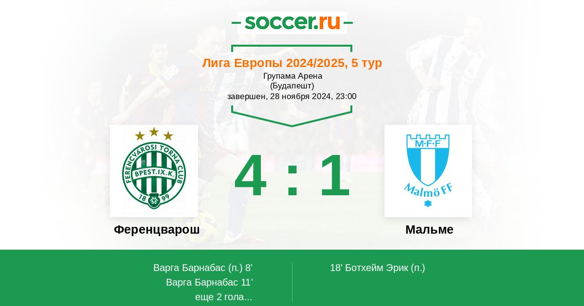 Протокол матча Ференцварош против Мальме