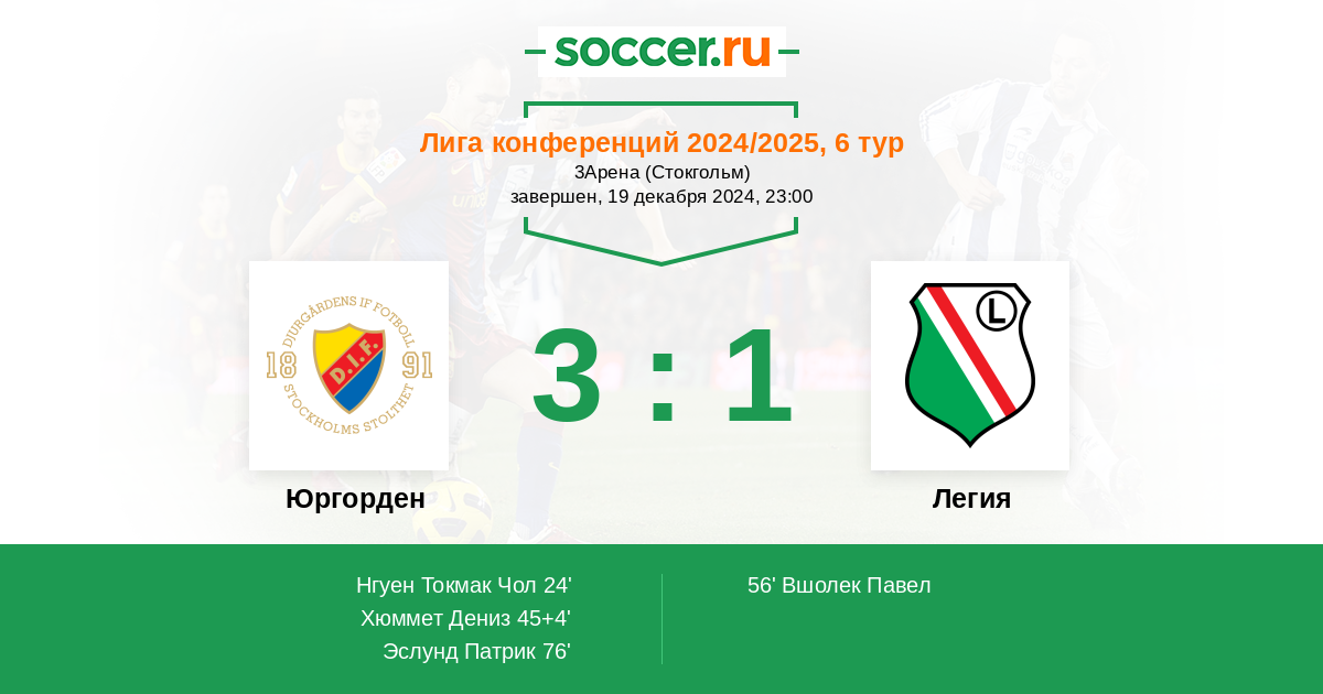 Юргорден - Легия ! Команды весьма не плохо выступают в ЛК , и по ходу постараются закрепить свой успех . Надеюсь и сегодня они будут атаковать и забивать . ТБ .