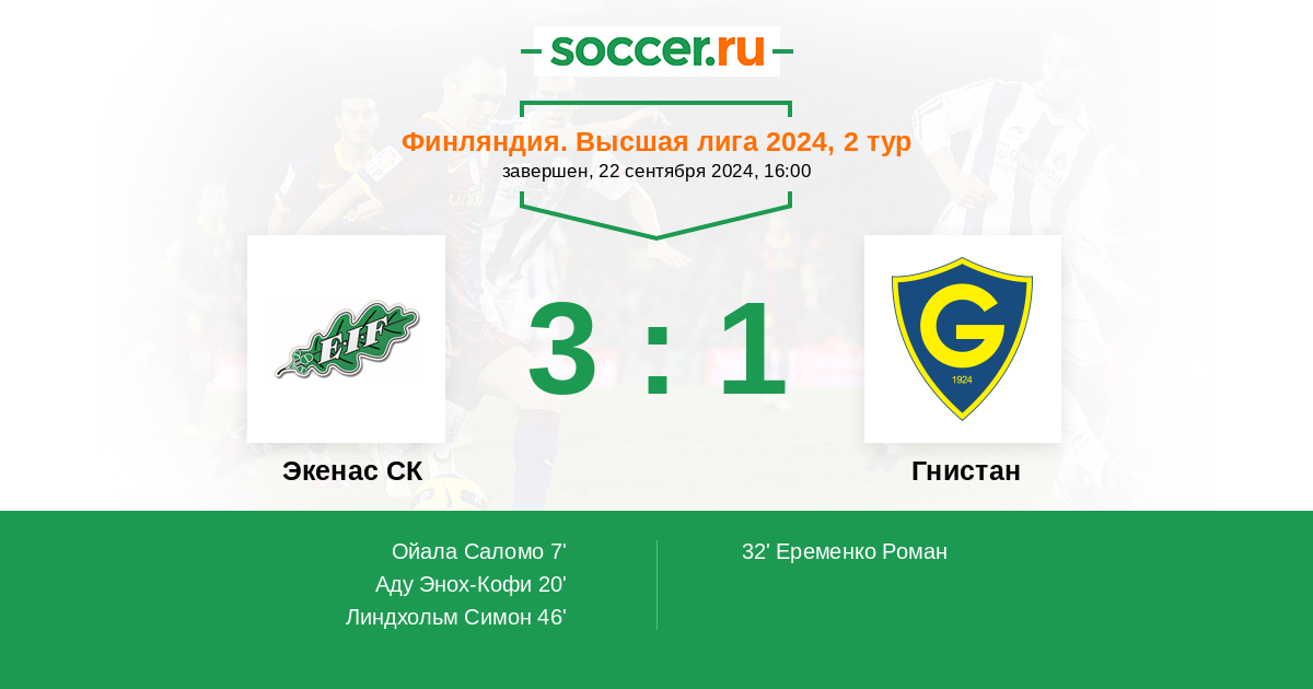 32' (2:1) Еременко Роман (26) (Латонен Йоаким (10))
