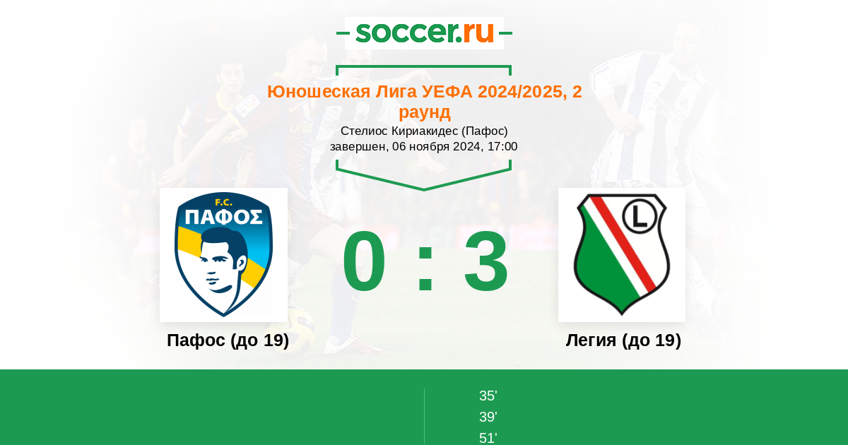 Протокол матча Пафос (до 19) против Легия (до 19)