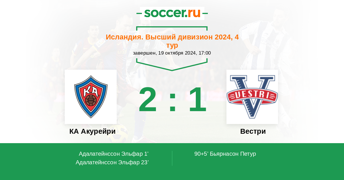 1' (1:0) Адалатейнссон Эльфар (9) (Вальссон Дагур (25))