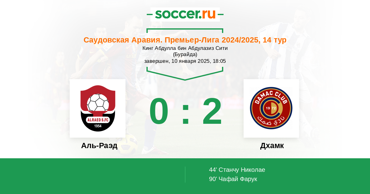 Футбольные команды Аль-Раед - Дхамк ФК всего сыграли между собой 10 матча. За 10 команде Аль-Раед удалось выиграть оппонента в 6 матчах, а футбольный клуб Дхамк ФК в свою очередь одержал 3 побед. По результатам личных встреч двух клубов Аль-Раед - Дхамк ФК, команды сыграли вничью 1 матчей. Последний матч в истории противостояний клубов прошел 27.05.24, и закончился со счетом 1:1. По результатам всех 10 сыгранных матчей разница голов команд составляет - 21-12...