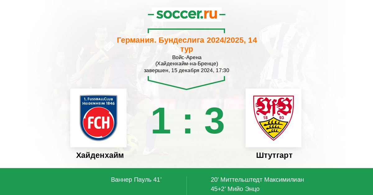 Хайденхайм - Штутгарт ! Последние игры этих клубов выглядят весьма результативными , да и между собой , в очных встречах команды довольно много забивают , не буду мудрить - ставлю на ТБ .