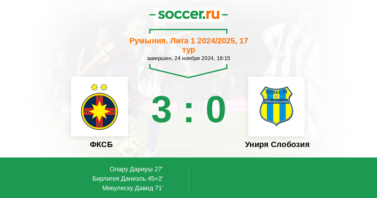 45+2' (2:0) Бирлигея Даниэль (9) (Олару Дариуш (27))