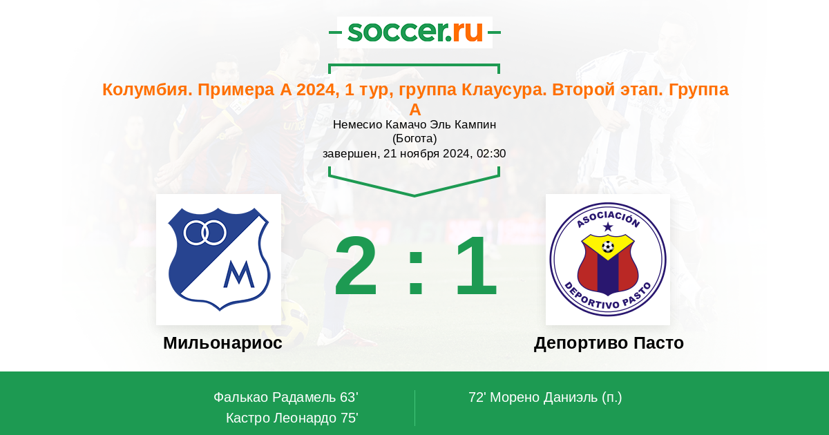 Протокол матча Мильонариос против Депортиво Пасто