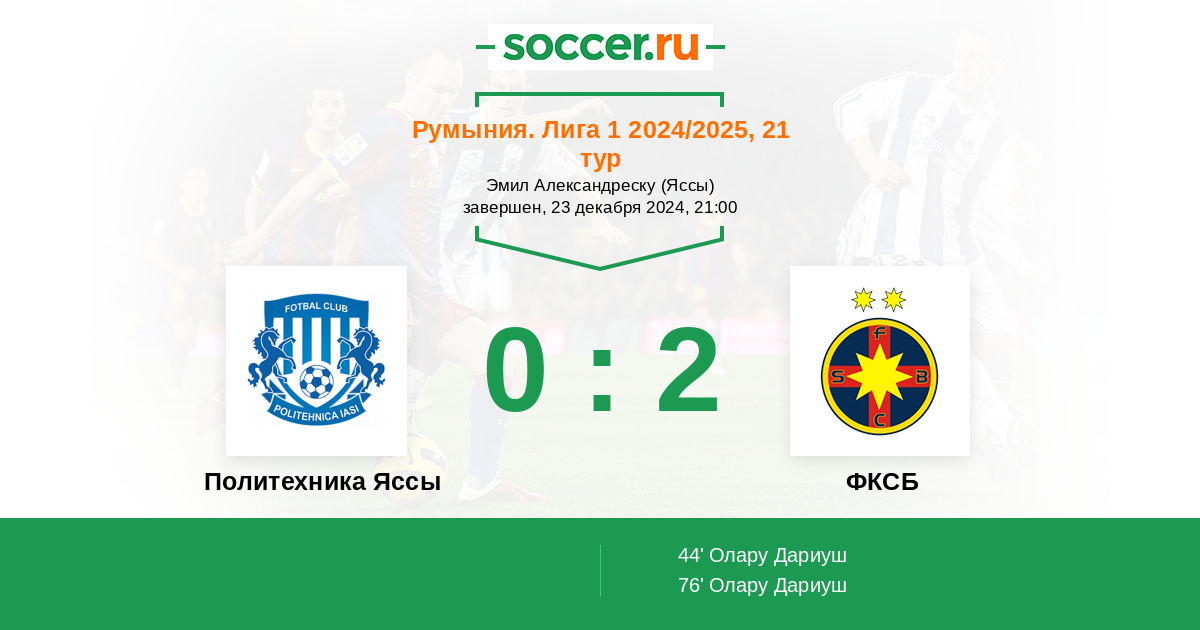44' (0:1) Олару Дариуш (27) (Шут Адриан (8))