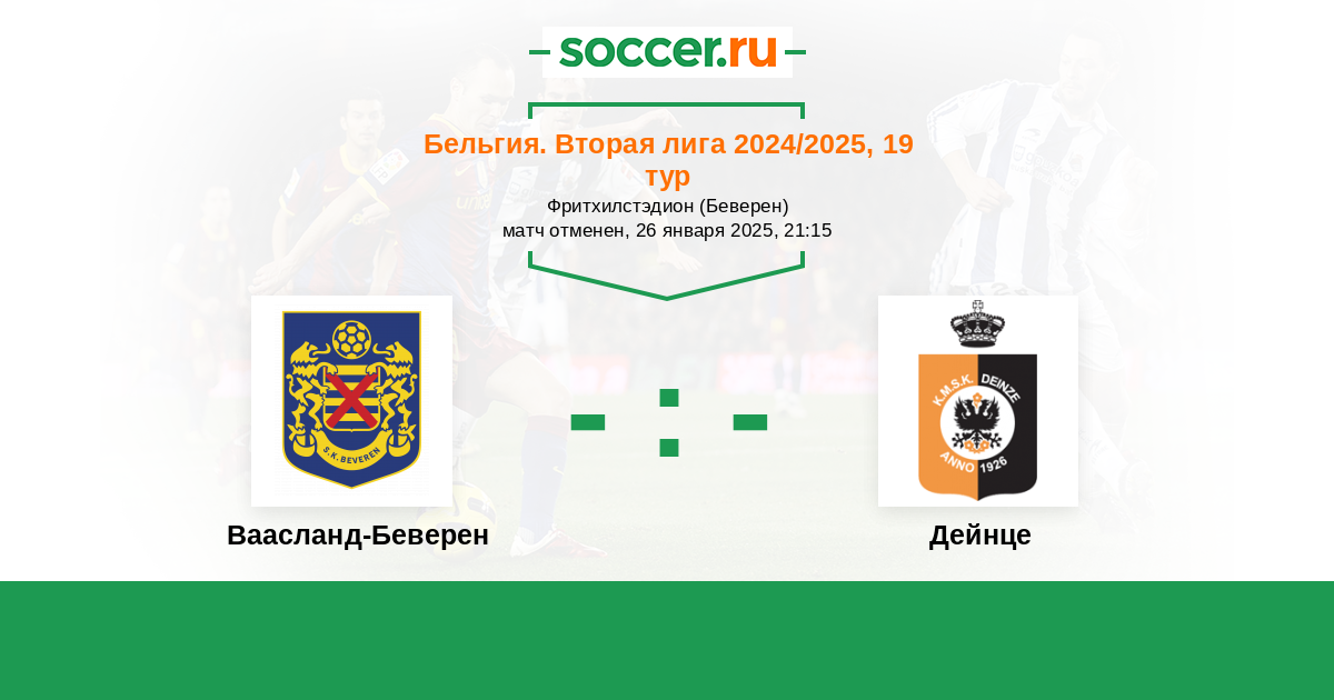 Бельгия. 1B Про Лига 22.08.2021 Ваасланд-Беверен Логотип футбольный клуб Ваасланд-Беверен 0:2 Логотип футбольный клуб Дейнце Дейнце