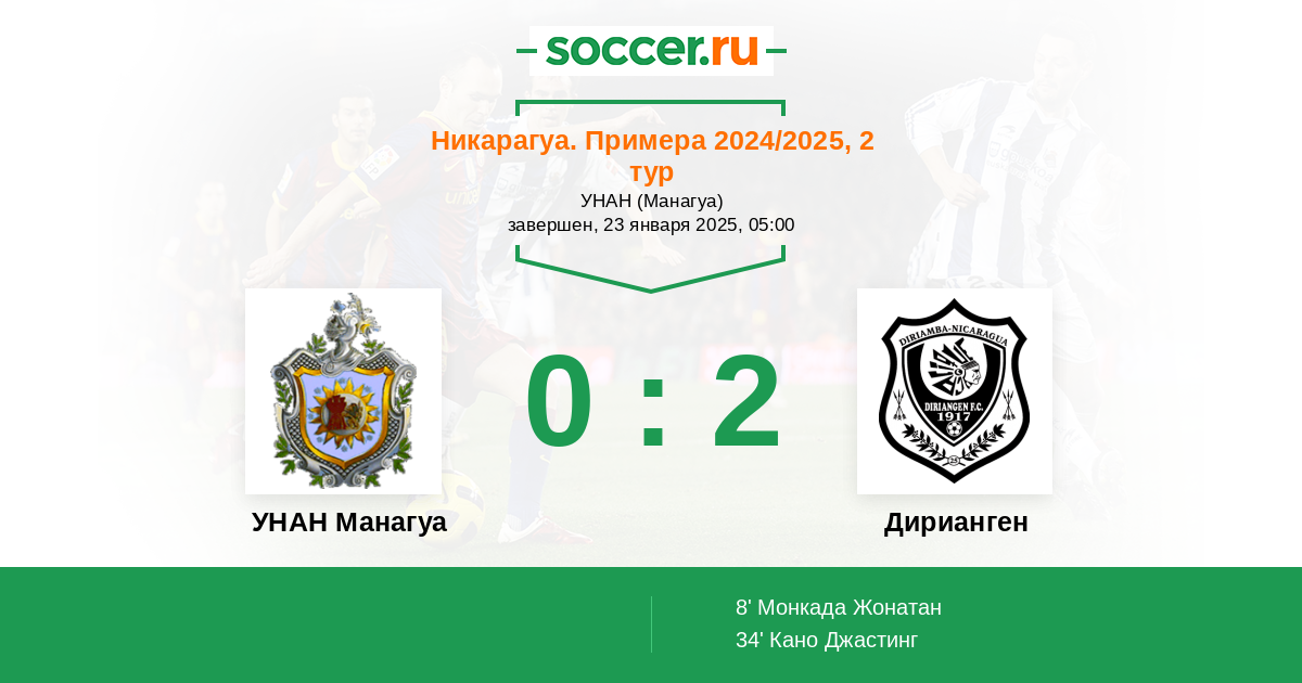 УНАН Манагуа - Дирианген ! Гости идут большим фаворитом , да и в последних очных встречах почти всегда громят своих соперников в сухую - пора менять хозяевам эту тенденцию . Рискую ОЗ .