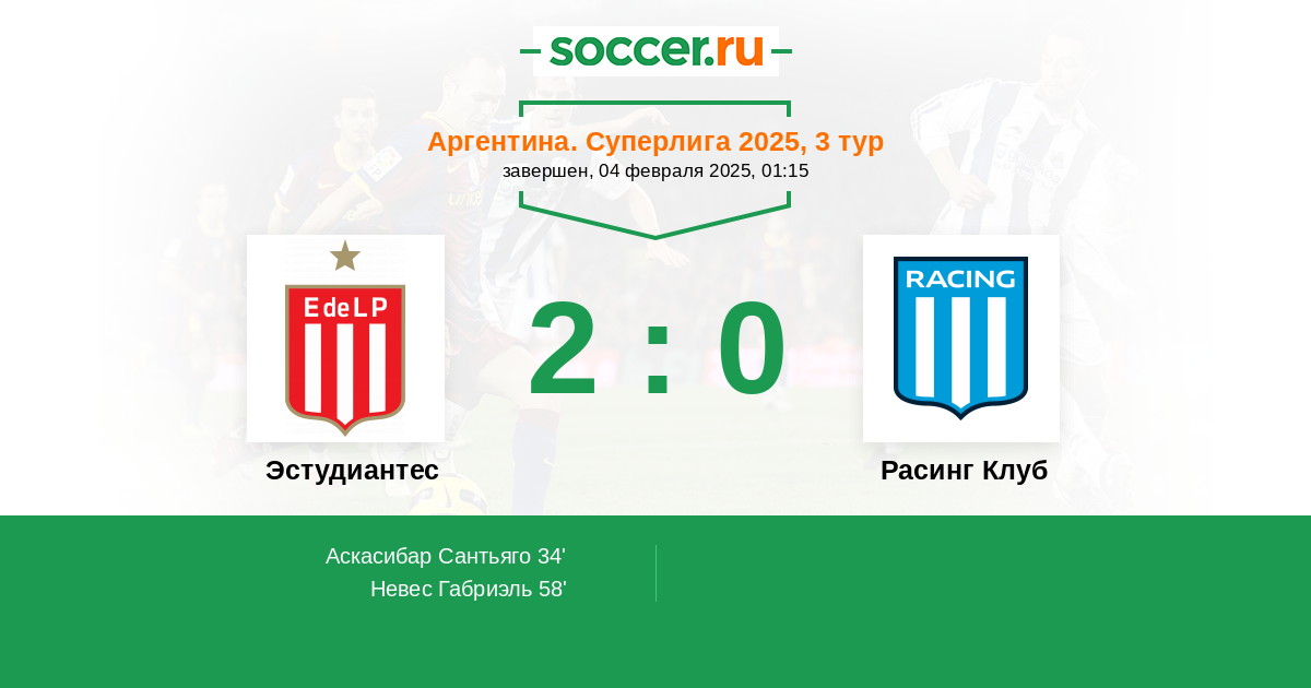 34' (1:0) Аскасибар Сантьяго (5) (Паласиос Тьяго (10))