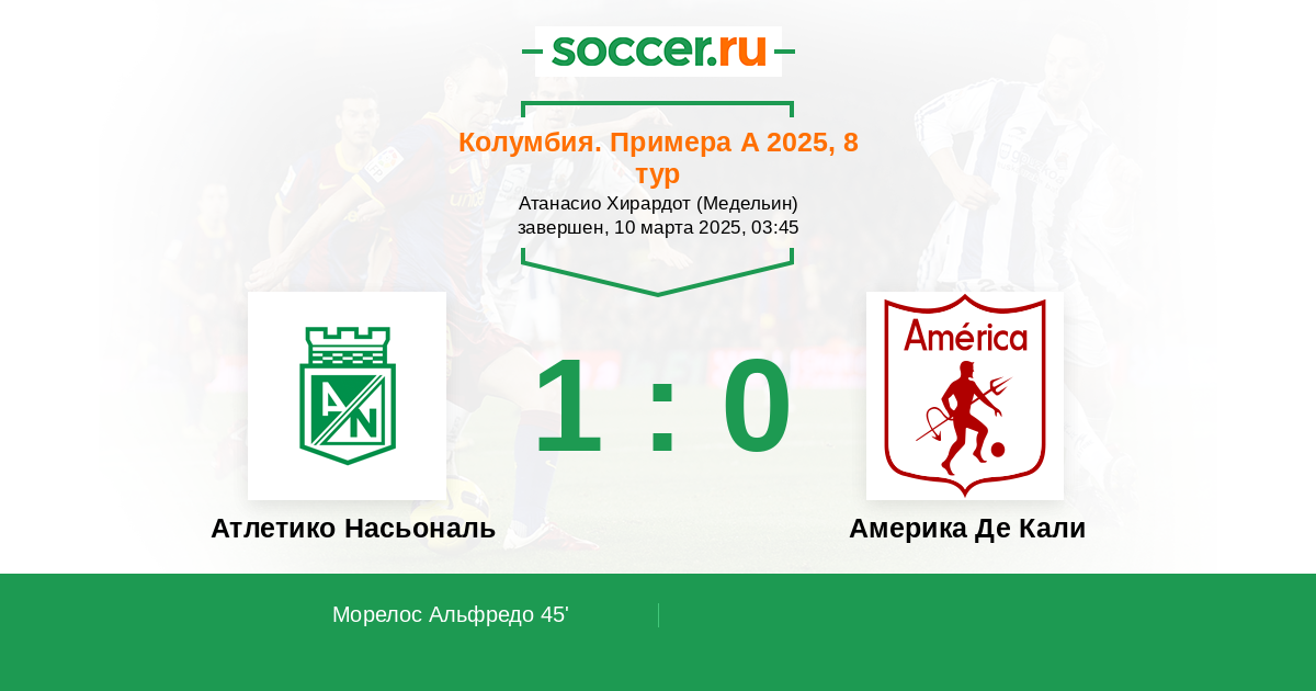 45' (1:0) Морелос Альфредо (9) (Кардона Эдвин (10))