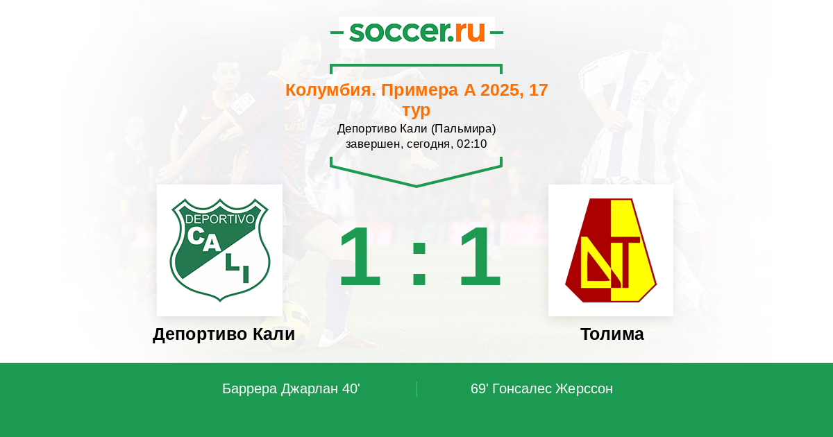 Протокол матча Депортиво Кали против Толима