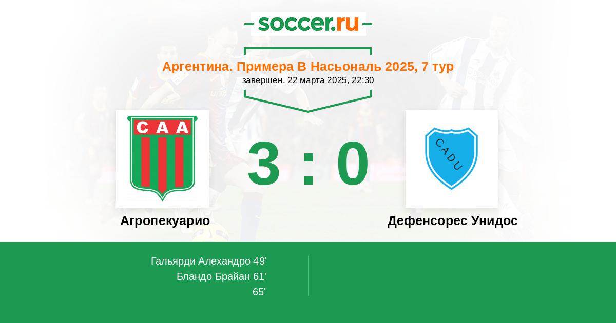 Протокол матча Агропекуарио против Дефенсорес Унидос