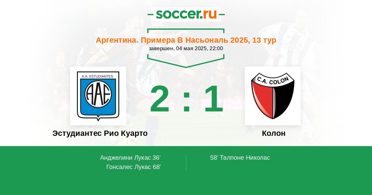 Протокол матча Эстудиантес Рио Куарто против Колон