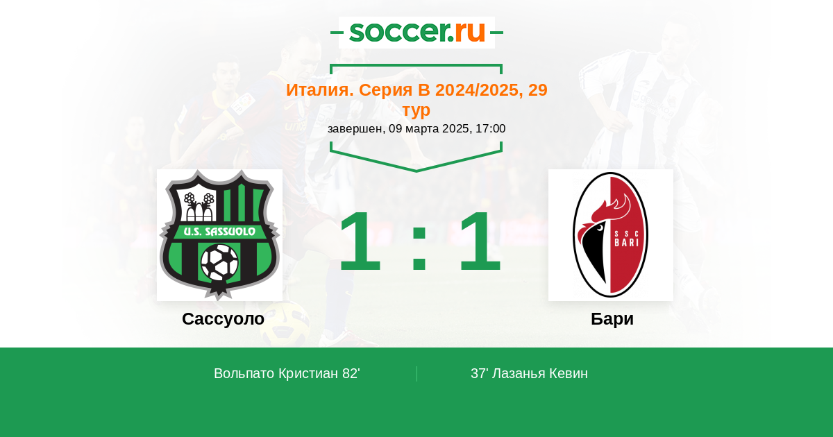 Протокол матча Сассуоло против Бари
