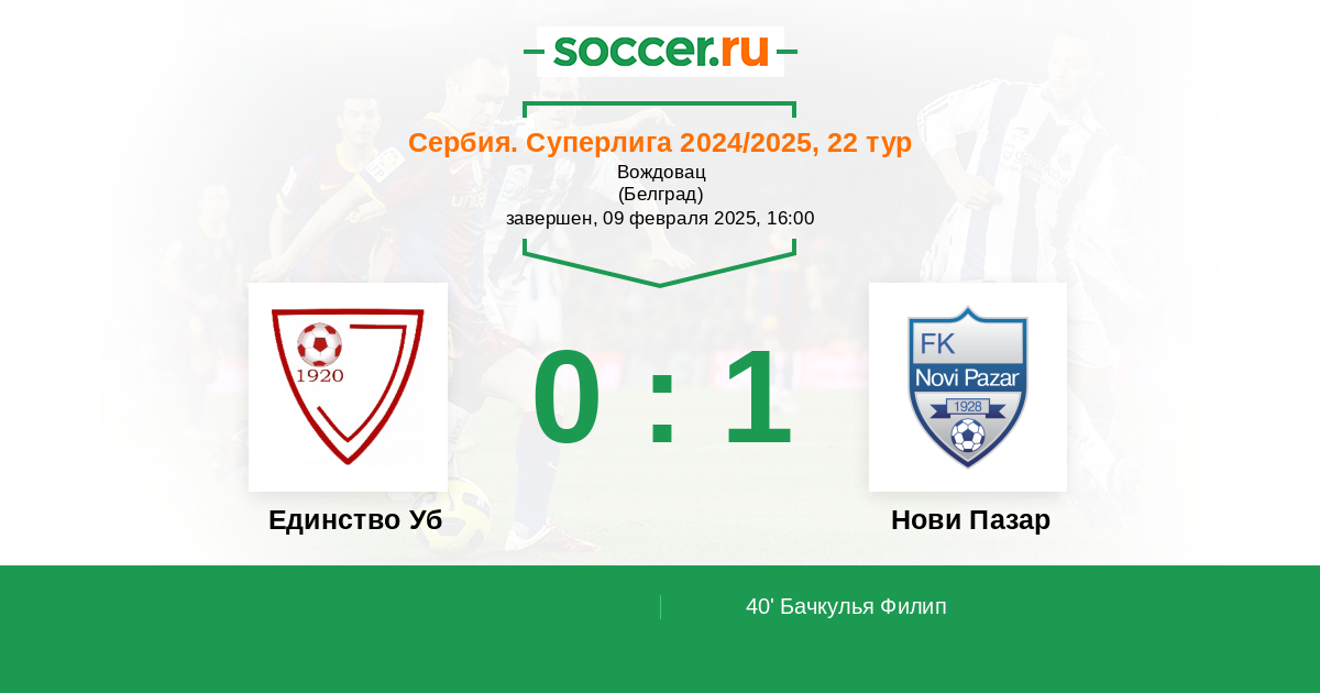 40' (0:1) Бачкулья Филип (15) (Милетич Неманья (3))