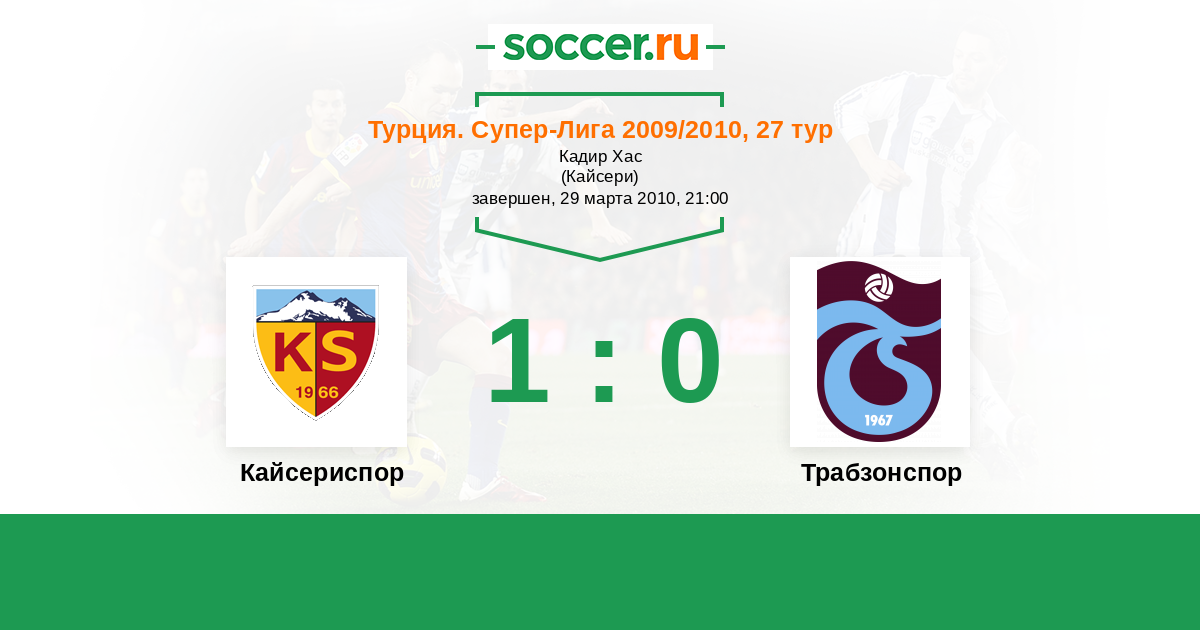 Турция. Суперлига 26.09.2010 Кайсериспор Логотип футбольный клуб Кайсериспор 0:0 Логотип футбольный клуб Трабзонспор Трабзонспор