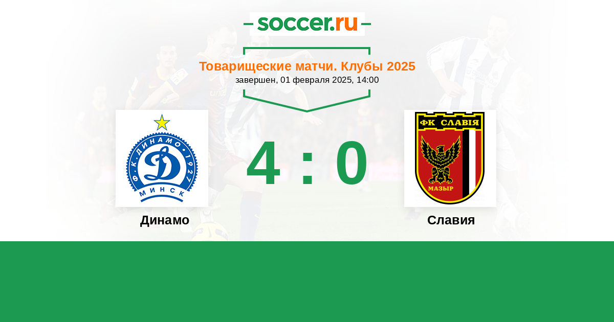 Товарищеские матчи. Клубы 04.02.2023 Динамо Логотип футбольный клуб Динамо (Минск) 2:1 Логотип футбольный клуб Славия (Мозырь) Славия