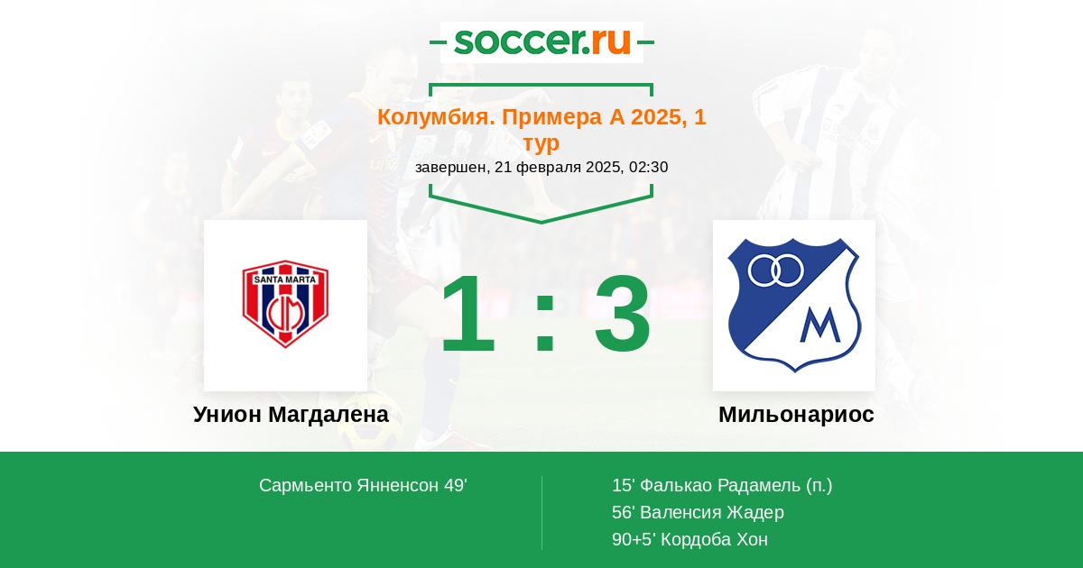 Протокол матча Унион Магдалена против Мильонариос