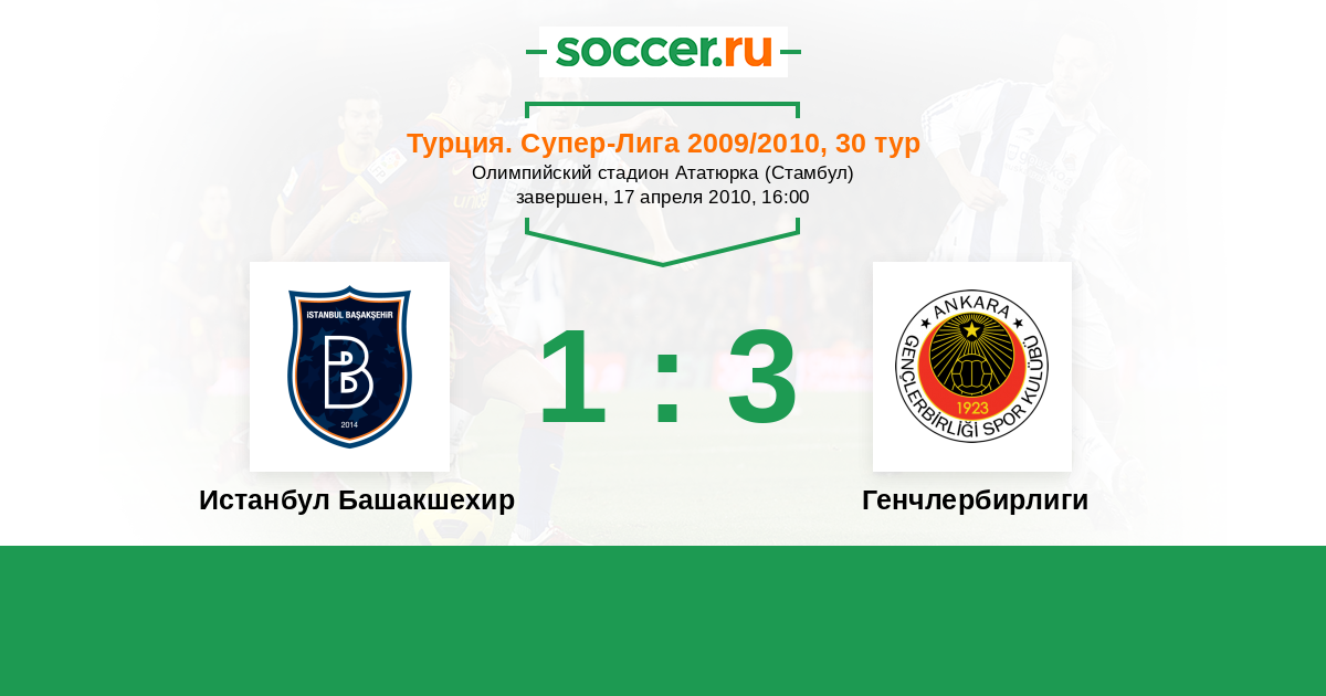 Турция. Суперлига 13.09.2010 Генчлербирлиги Логотип футбольный клуб Генчлербирлиги (Анкара) 2:1 Логотип футбольный клуб Истанбул Башакшехир (Стамбул) Истанбул Башакшехир