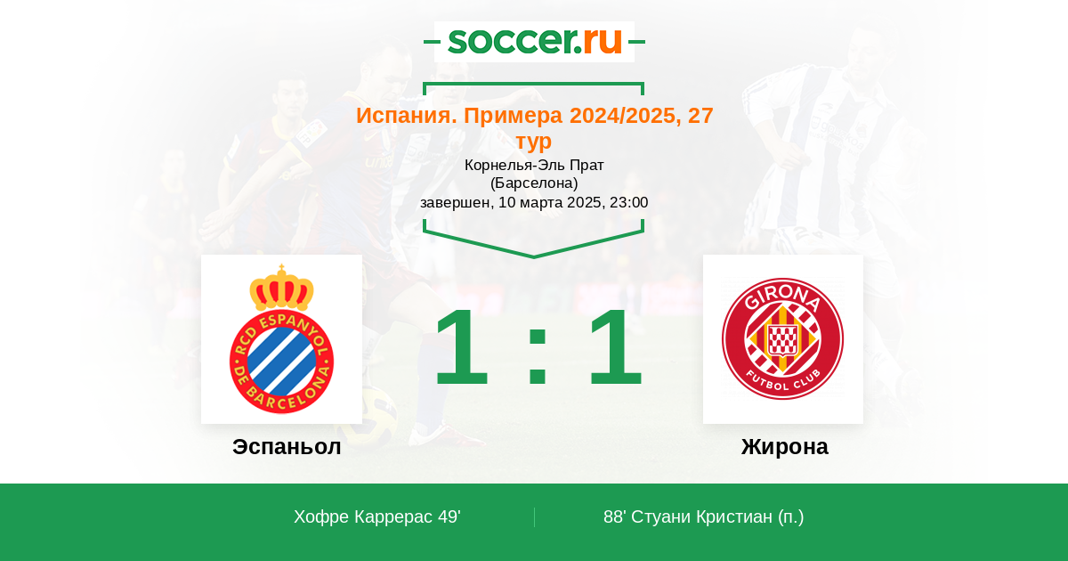 Эспаньол - Жирона ! Команды сейчас примерно одного уровня , да и находятся по соседству в тур . таблице . Предположу , что по крайней мере обмен голами . ОЗ .