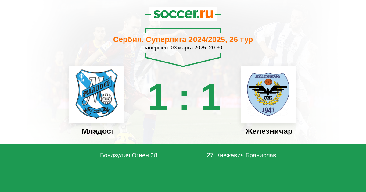 28' (1:1) Бондзулич Огнен (11) (Любомирач Урош (77))