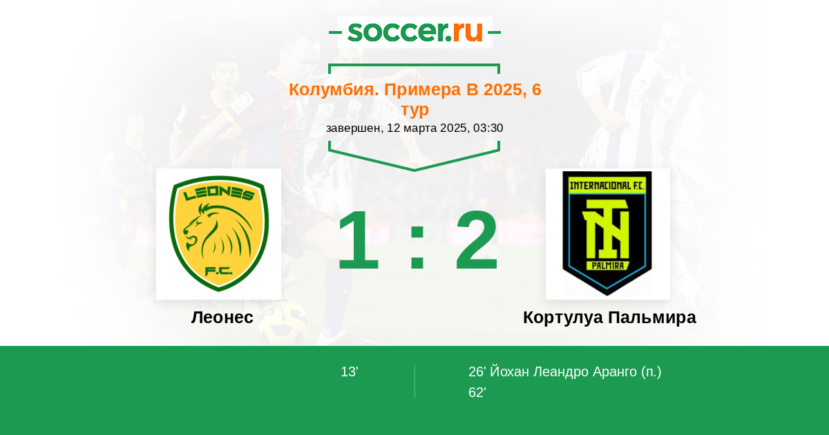 26’ 1:1(П) Йохан Леандро Аранго