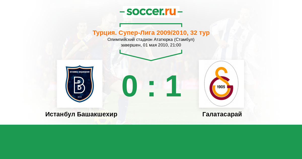 Турция. Суперлига 26.09.2010 Галатасарай Логотип футбольный клуб Галатасарай (Стамбул) 3:1 Логотип футбольный клуб Истанбул Башакшехир (Стамбул) Истанбул Башакшехир