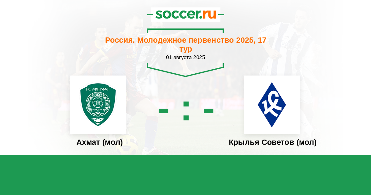 Россия. Премьер-Лига U21 20.09.2019 Ахмат (мол) Логотип футбольный клуб Ахмат (мол) (Грозный) 3:1 Логотип футбольный клуб Крылья Советов (мол) (Самара) Крылья Советов (мол)