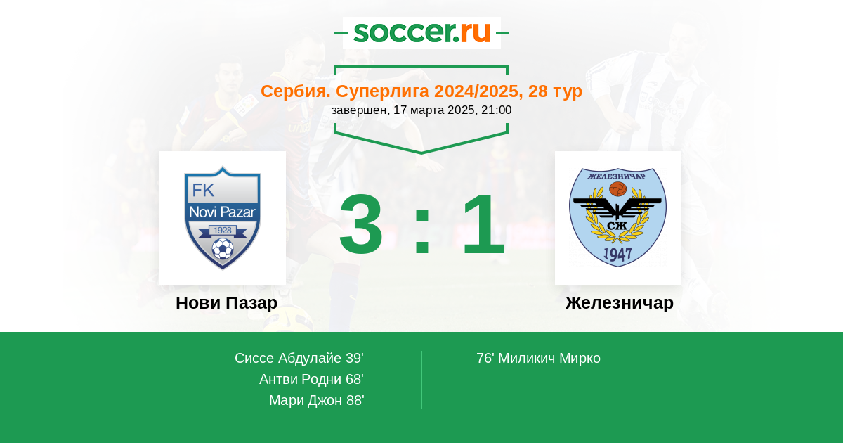 76' (2:1) Миликич Мирко (6) (Цветкович Стефан (11))