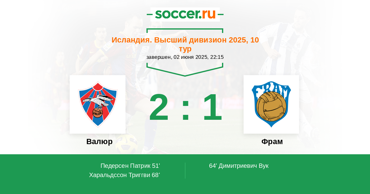 51' (1:0) Педерсен Патрик (9) (Антонссон Бьярни Марк (6))