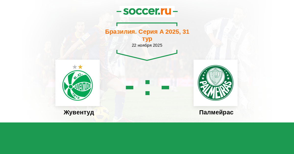 Бразилия. Серия А 21.10.2024 Жувентуд Логотип футбольный клуб Жувентуд (Кашиас-ду-Сул) 3:5 Логотип футбольный клуб Палмейрас (Сан-Паулу) Палмейрас