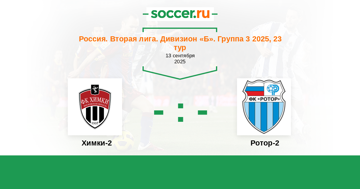 Россия. Вторая лига. Группа 3 28.09.2019 Химки-2 Логотип футбольный клуб Химки-2 1:4 Логотип футбольный клуб Ротор-2 (Волгоград) Ротор-2