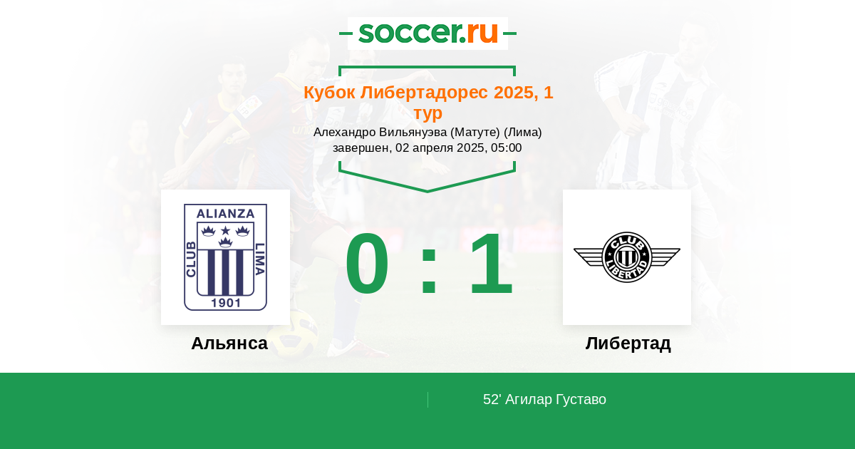 52' (0:1) Агилар Густаво (11) (Мартинес Уго (22))