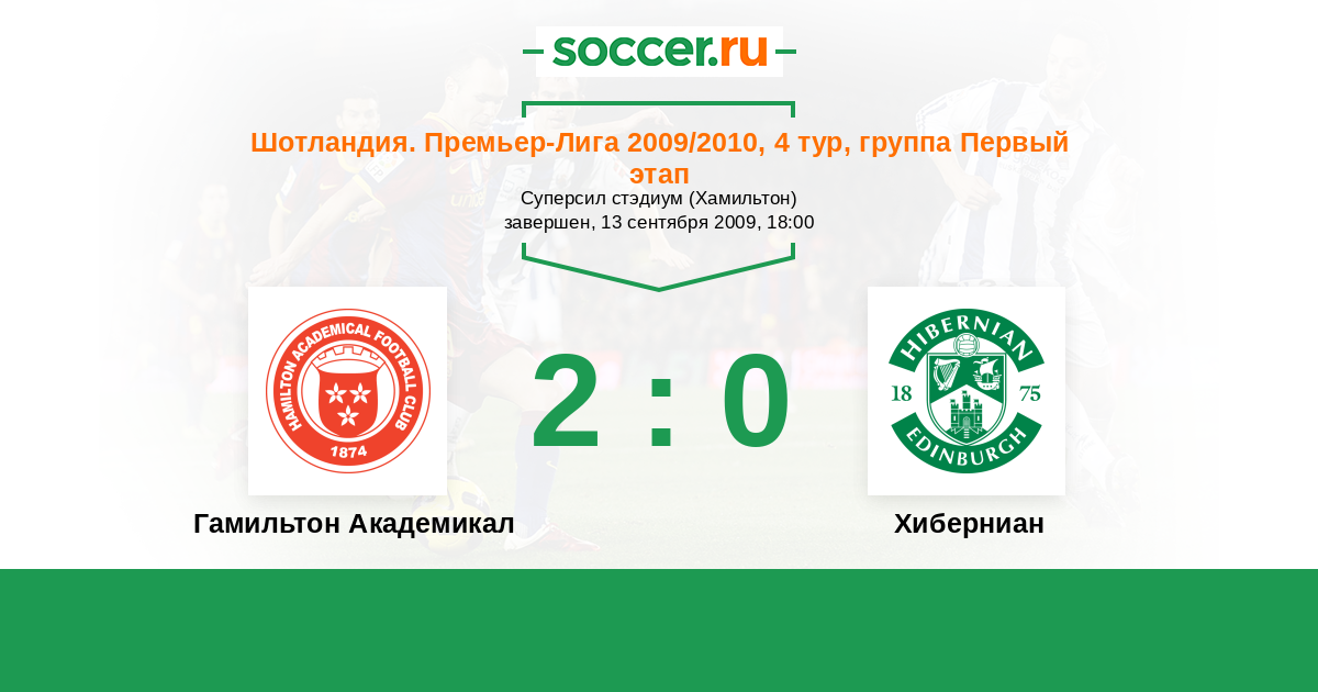 Шотландия. Премьер-Лига 18.09.2010 Хиберниан Логотип футбольный клуб Хиберниан (Эдинбург) 1:1 Логотип футбольный клуб Гамильтон Академикал Гамильтон Академикал