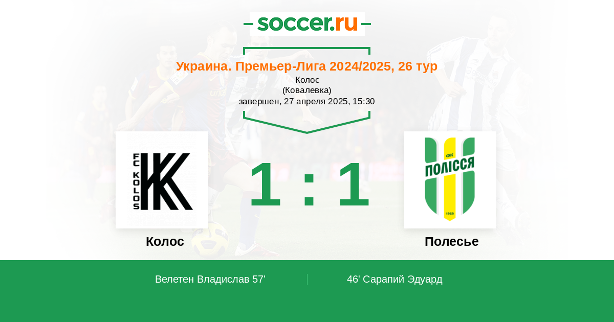 Протокол матча Колос против Полесье