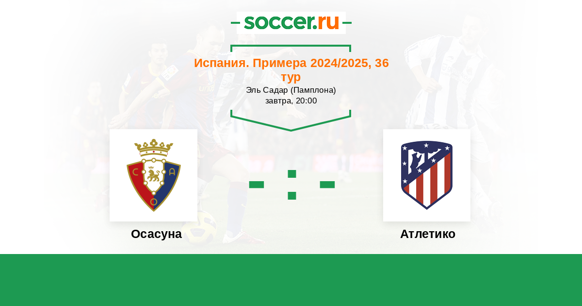 Мадридский Атлетико обеспечил себе место в Лиге Чемпионов на будущий сезон и думается не будет сверхмотивирован на сегодняшнюю игру с Осасуной, а вот Осасуна сохраняет шанс побороться за еврокубковую зону и сыграет с полной самоотдачей.