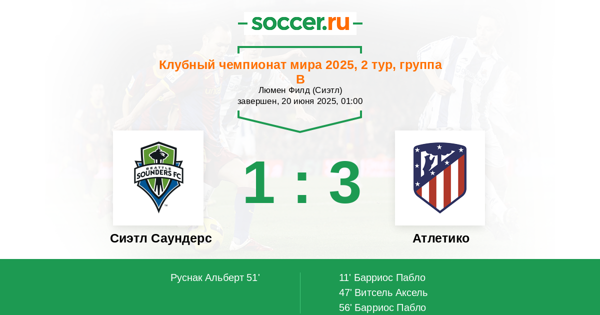 В предстоящем матче 2 - го тура нового клубного чемпионата мира 2025 между командами Сиэтл Саундерс Соединённые Штаты Америки и Атлетико Мадрид Испания , явным фаворитом на победу является команда номинальных гостей Атлетико Мадрид.