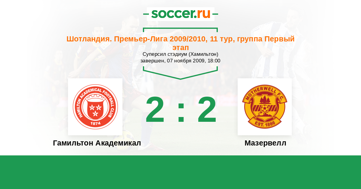 Шотландия. Премьер-Лига 30.10.2010 Мазервелл Логотип футбольный клуб Мазервелл 0:1 Логотип футбольный клуб Гамильтон Академикал Гамильтон Академикал