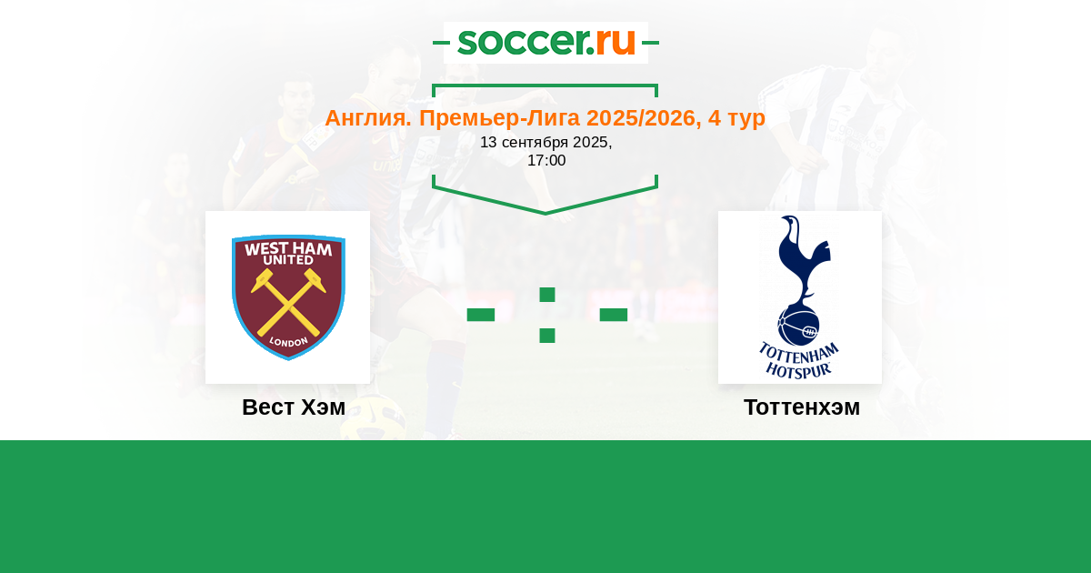 У этого матча хорошая вывеска, будет интересно. Вест Хэм очень приличная команда, но старт получился плохой — 16 место и 8 пропущенных мячей. Тоттенхэм, наоборот, начал довольно резво. Неужели он возвращается? Тогда нужно выигрывать. Победа гостей.