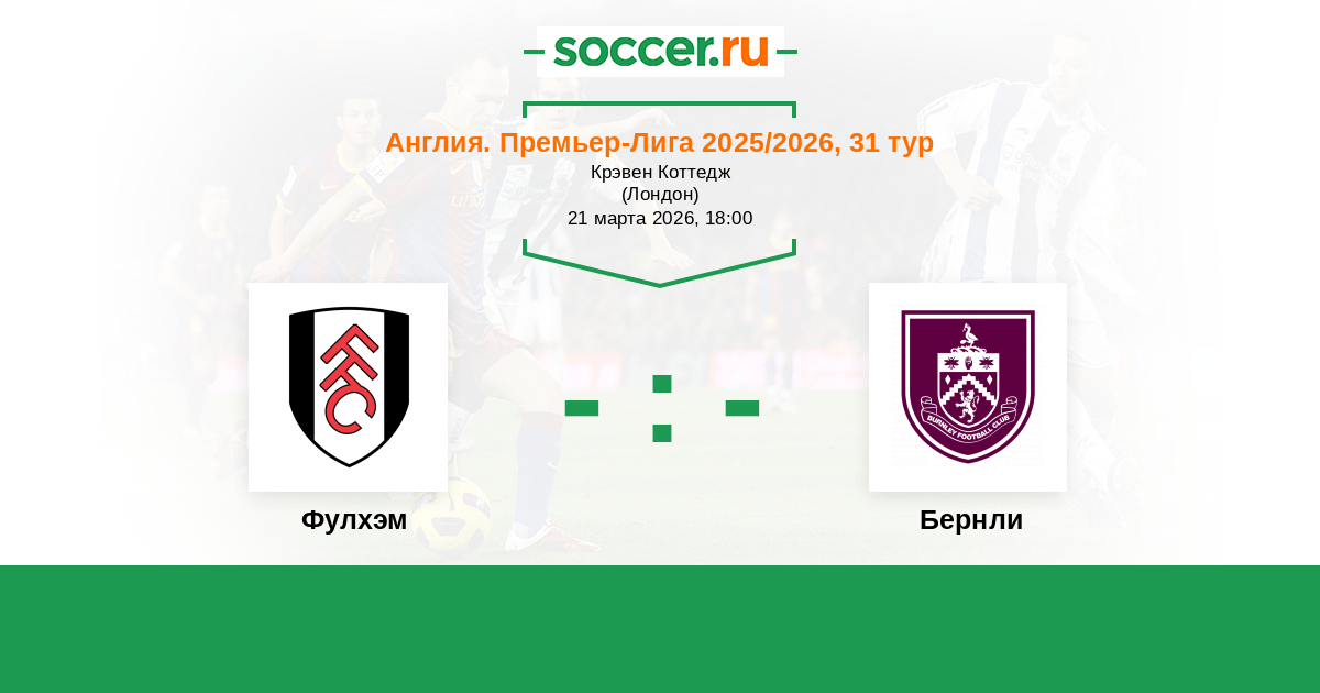 Англия. Премьер-Лига 13.12.2025 Бернли Логотип футбольный клуб Бернли 2:3 Логотип футбольный клуб Фулхэм (Лондон) Фулхэм